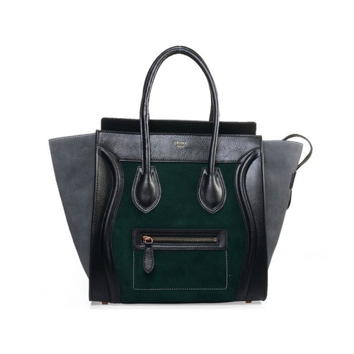 Borsa Tote media Celine Luggage in pelle di vitello nera/scamosciata verde scuro