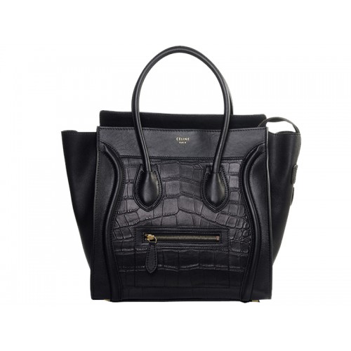 Borsa tote media Celine Luggage in pelle di vitello nera con stampa coccodrillo