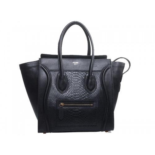 Borsa Tote media Celine Luggage in pelle di vitello nera con inserti in pelle di serpente nera