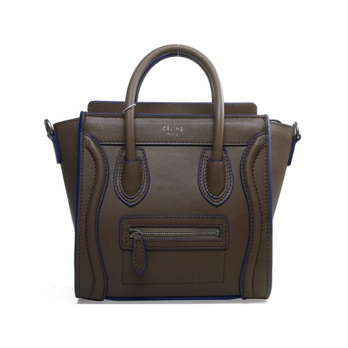 Celine Luggage Mini Tote in pelle di vitello color cachi con finiture blu