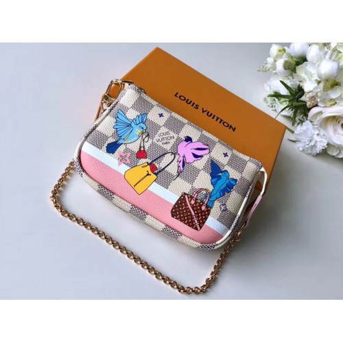 Ispirata alle vetrate natalizie Louis Vuitton delle Galeries Lafayette di Parigi, la Mini Pochette Accessoires in tela Damier Azur è impreziosita da una stampa di fantasiosi uccelli da gioco. Grazie alla sua catena color oro, questa elegante borsa può essere attaccata a un'altra borsa o trasportata da sola.