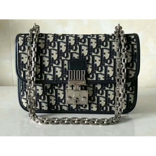 Borsa con patta Dioraddict in tela Dior, chiusura con firma e catena staccabile in metallo argentato invecchiato.