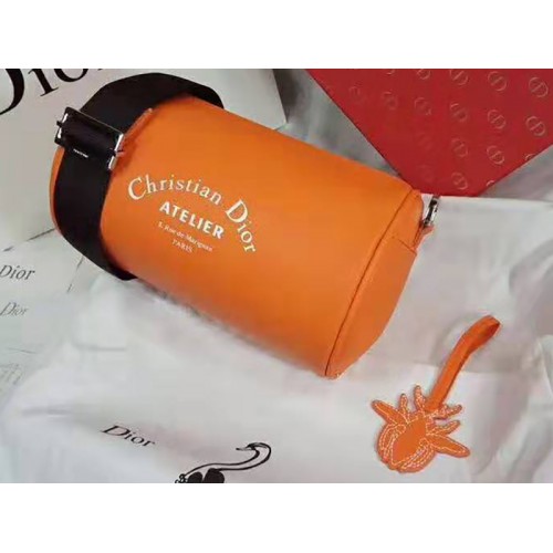 "Busta a rullo" in pelle di vitello denim a grana arancione con stampa "Christian Dior Atelier".