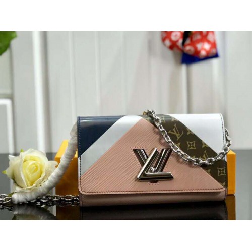 Il portafoglio a catena Twist ha un nuovo look audace per l'animazione Twist Graphic Tape. Blocchi di pelle colorata vengono accostati a una fascia con motivo monogramma grazie a tecniche uniche di lavorazione della pelle. Questo portafoglio, che può essere indossato anche come piccola borsa a tracolla, è dotato dell'emblematico lucchetto a rotazione LV della linea Twist.