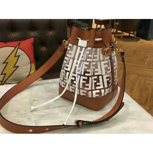 Borsa a secchiello Mon Tresor con chiusura a coulisse e decorazioni metalliche a forma di logo Fendi. Due spallacci staccabili, uno lungo e uno corto, per trasportare la borsa a mano, sopra la spalla o a tracolla. Realizzato in pelle di vitello marrone. Iconico motivo FF in rilievo e dipinto a mano in nero. Articoli in metallo con finitura dorata.