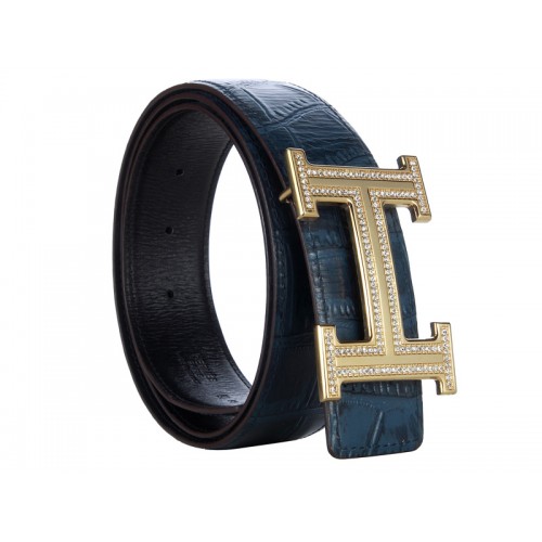 Cintura Hermes in pelle di coccodrillo con fibbia H dorata e diamante blu scuro