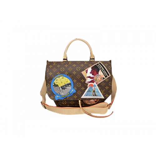 -Monogram Canvas, manici in pelle di mucca, rifinitura & chiusura a nastro. 9 toppe ricamate, basate sul lavoro dell'artista, Tasca centrale più 2 tasche interne, patta magnetizzata, fodera in microfibra, ferramenta in ottone argentato.