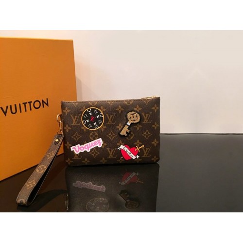 Un omaggio alla tradizione di produzione di bauli della Casa, questo City Pouch in tela Monogram è decorato con toppe stampate e ricamate, che ricordano gli adesivi da viaggio che si trovavano sui bauli alla fine del XIX secolo. Il cinturino da polso rimovibile conferisce praticità e stile a una borsa versatile.