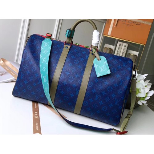 Con un nuovo look tecnico e ispirato allo sport presentato da Kim Jones allo Spring-Summer Show 2018, questo Keepall 45B unisce tela Monogram blu Pacifico e pelle Taiga e pezzi metallici colorati, per un fascino sportivo chic.
