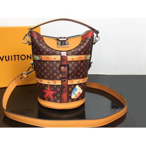 La borsa Duffle Time Trunk presenta una rivisitazione giocosa delle firme della Maison per l'autunno-inverno 2018. Un effetto pittorico sulla tela Monogram trasformata richiama l'attenzione sugli adesivi luminosi e storici per bagagli. Cinturini con fibbia e borchie color oro richiamano le radici della maison nella produzione di bauli, creando nel processo un effetto trompe-l'oeil. Gli accessori color argento invecchiati completano il look di ispirazione vintage della borsa.