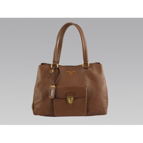 Borsa tote media in pelle di vacchetta Prada con tasca frontale marrone